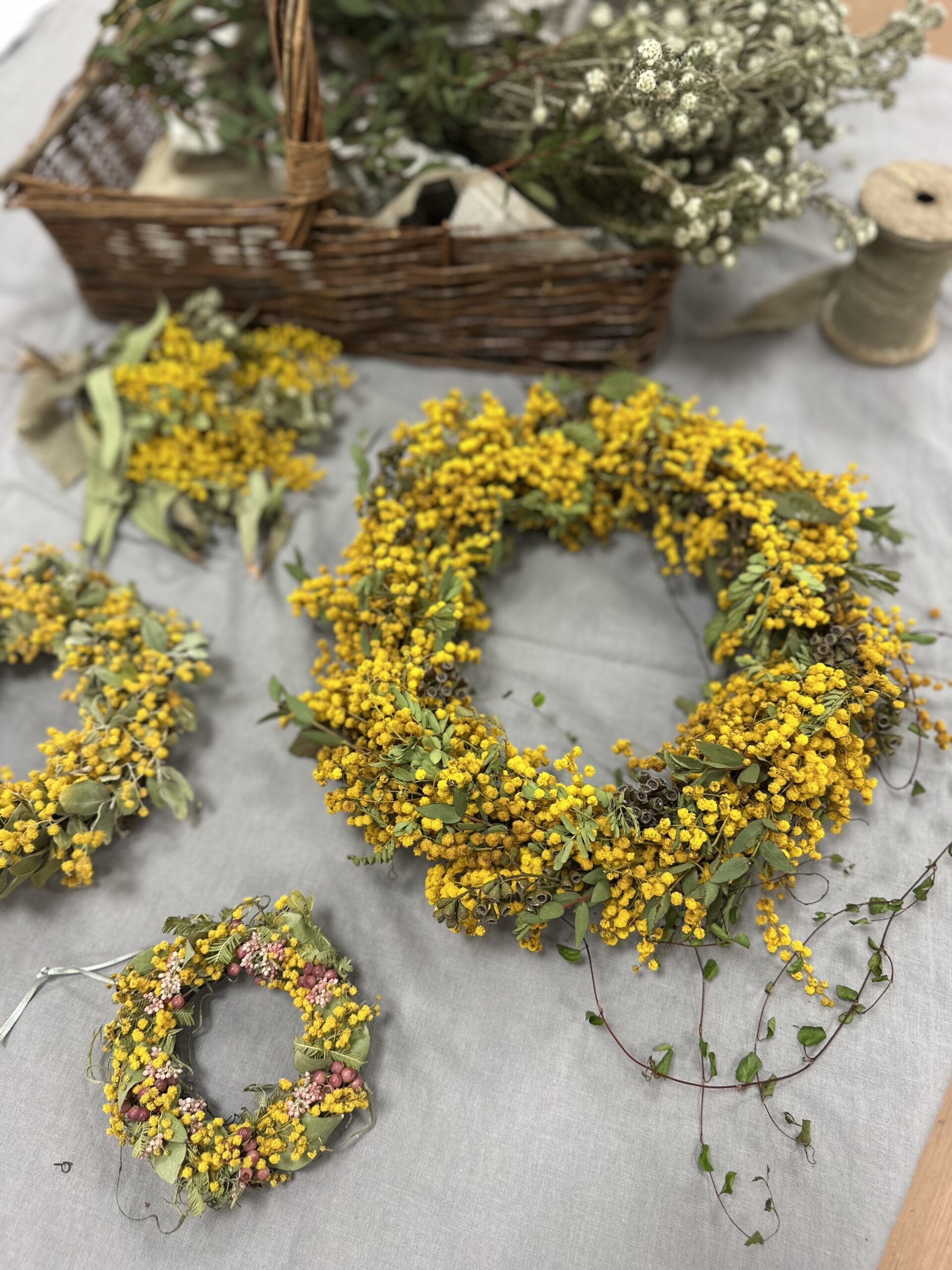 「オーバルなミモザのリース」を作ります。お庭を散策するような気持ちで、季節の植物を紡いでリースやスワッグを作り暮らしを楽しみましょう。ミモザ(アカシア)は仕入れ時に黄色くふわふわの一番良い状態の種類を使います。