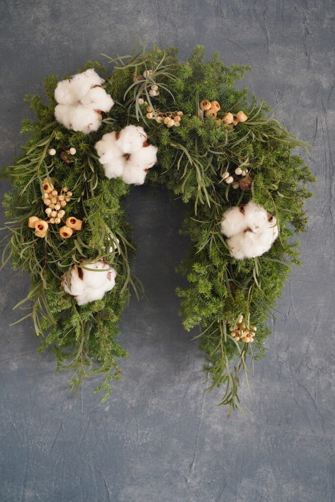 モミやヒノキなどの針葉樹をベースに、綿花や木の実をあしらって、幸運をもたらすと言われる馬蹄(ばてい)型のナチュラルなリースを作ります。綺麗にドライになり、長く楽しんでいただけます。