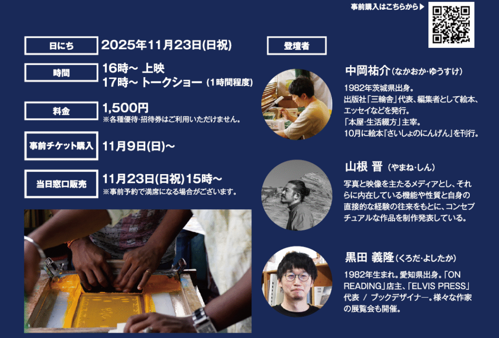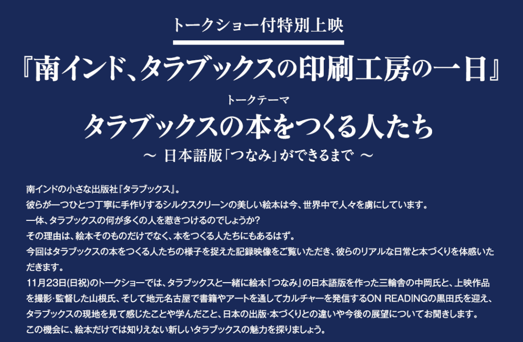 NAGOYA CINEMA Week2025 トークショー付き特別上映『南インド、タラブックスの印刷工房の一日』 2025.11.23〜2025.11.23 三越映画劇場(星ヶ丘三越9F) 本イベントに関するお問い合わせ 星が丘テラス営業部 052-781-1266(10:00~18:00) 事前チケット購入:11月9日(日)~販売 購入はコチラから ニュース&イベント一覧へ戻る