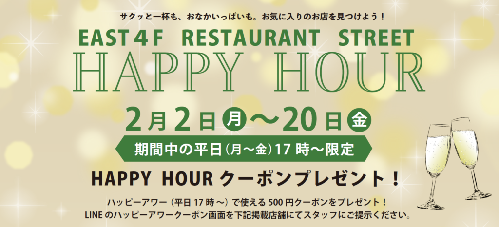 期間中の平日(月~金)17時~限定で、EAST4階対象レストランにて、特別メニューを展開。