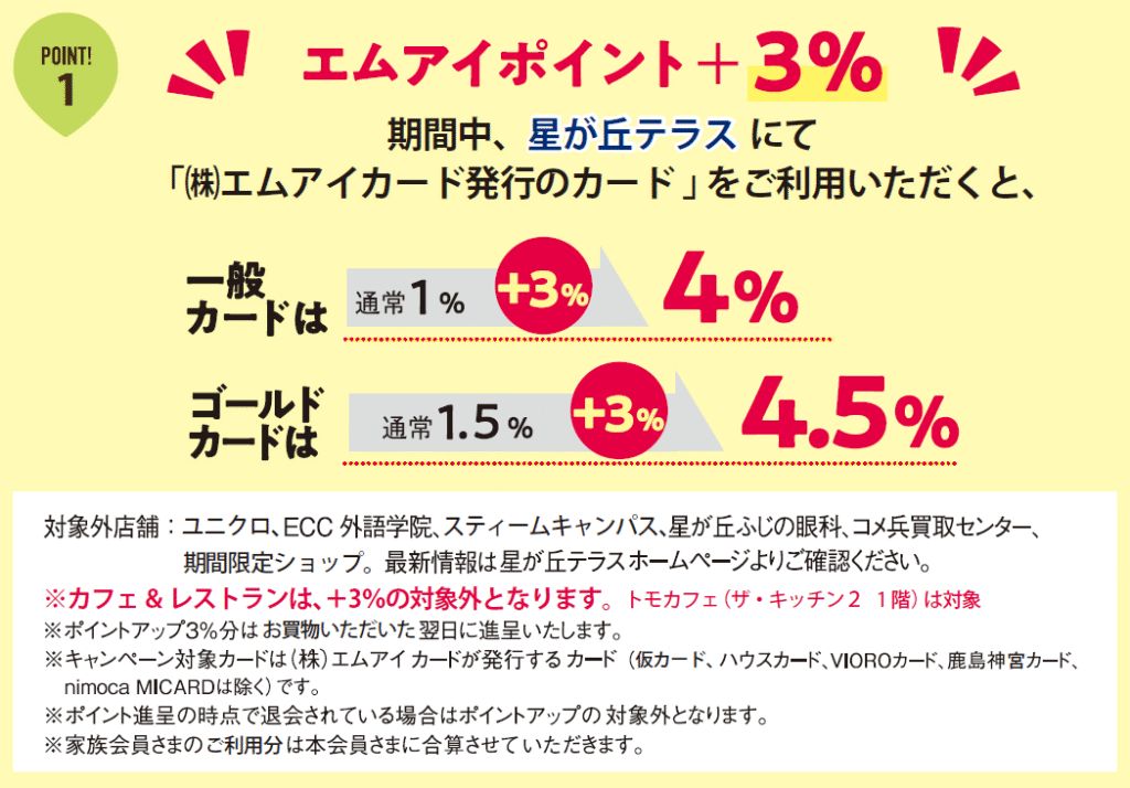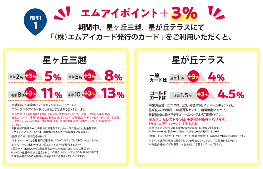 期間中、星が丘テラスにて「(株)エムアイカード発行のカード」をご利用いただくと、エムアイポイント+3%