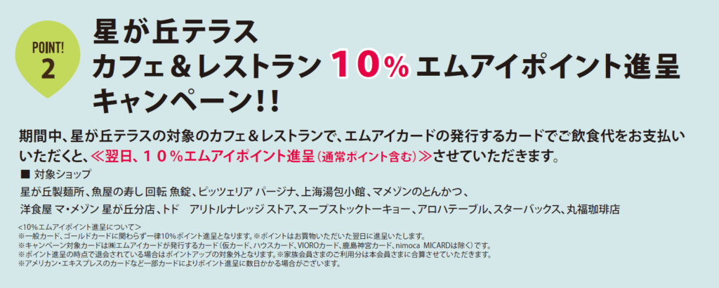 期間中、星が丘テラスの対象のカフェ&レストランで、エムアイカードの発行するカードでご飲食代をお支払いいただくと、≪翌日、10%エムアイポイント進呈(通常ポイント含む)≫させていただきます。