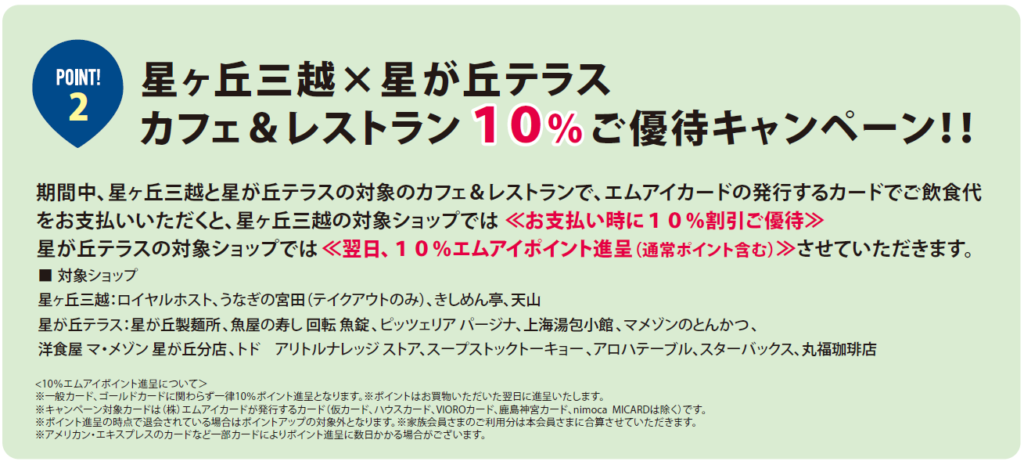 期間中、星ヶ丘三越と星が丘テラスの対象のカフェ&レストランで、エムアイカードの発行するカードでご飲食代をお支払いいただくと、星ヶ丘三越の対象ショップでは≪お支払い時に10%割引ご優待≫