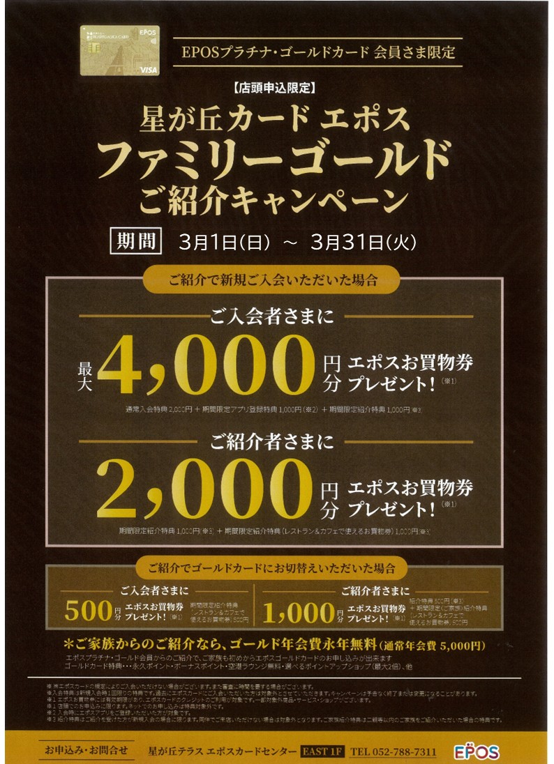 お一人ご紹介につき 期間限定紹介特典【1,000円分】の星が丘カードエポスお買物券+期間限定〈ご家族〉紹介特典(レストラン&カフェで使えるお買物券)【1,000円分】をプレゼント‼
