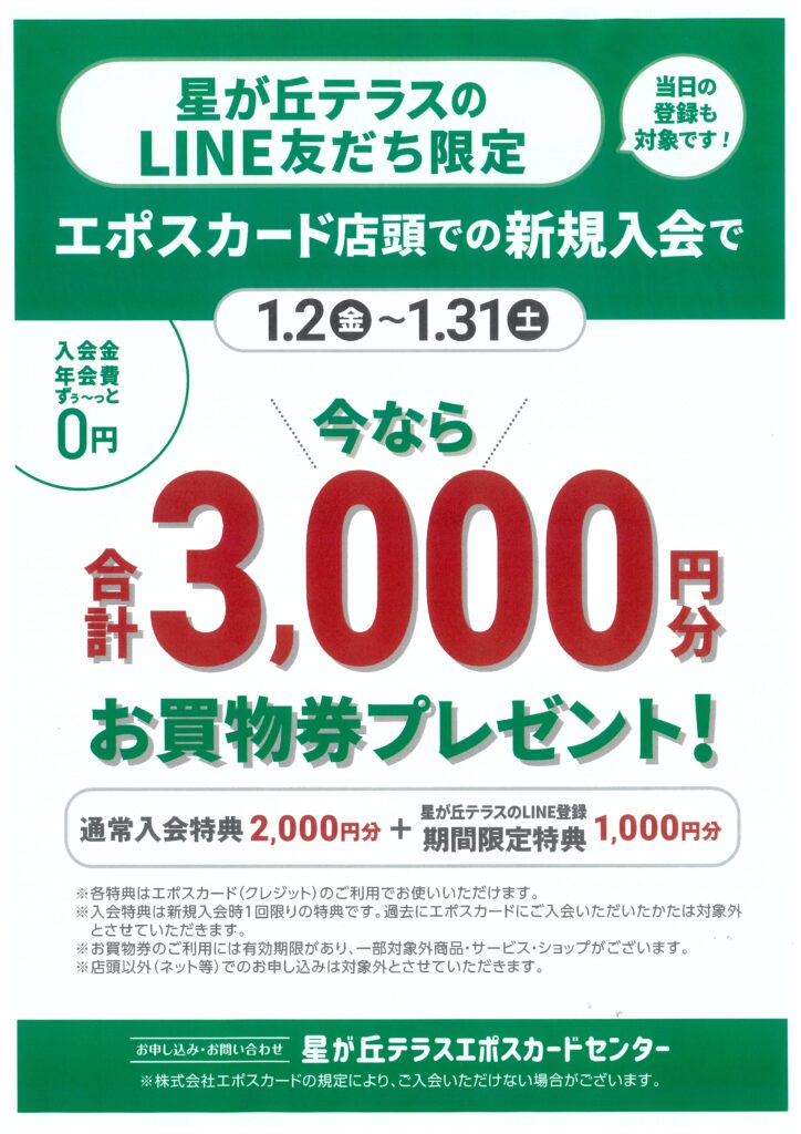 星が丘テラスLINE友だち限定! 新規入会 今なら合計3,000円分プレゼント!
